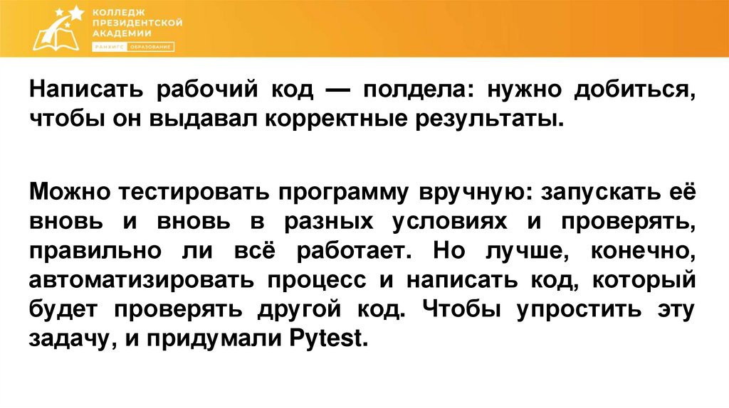 Написать рабочий код — полдела: нужно добиться,чтобы он выдавал корректные результаты.