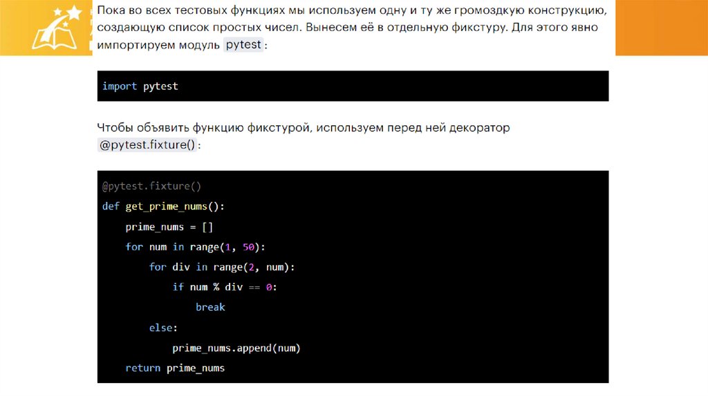 • Примечание – В одном тесте может быть сразу несколько операторовassert, но делать так не рекомендуется. Лучше руководствоваться