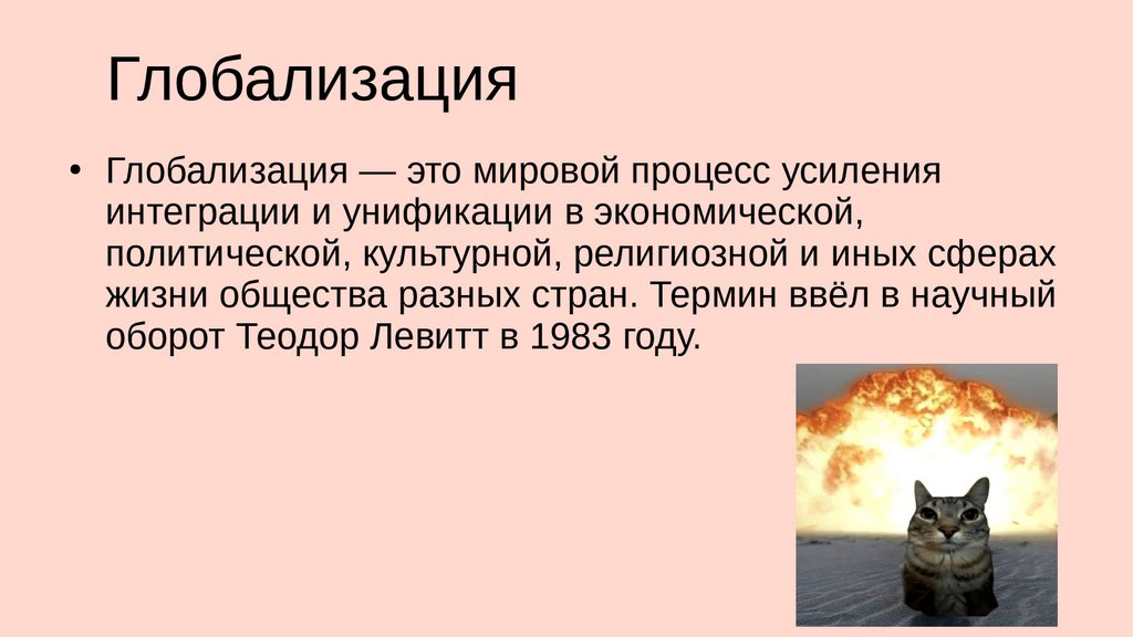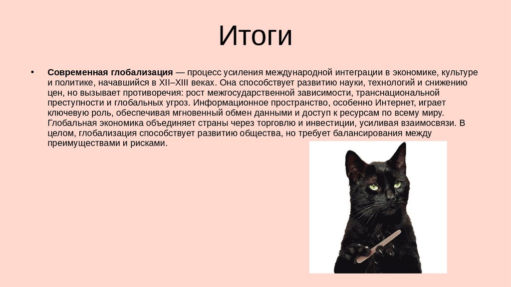 ИтогиСовременная глобализация — процесс усиления международной интеграции в экономике, культуре