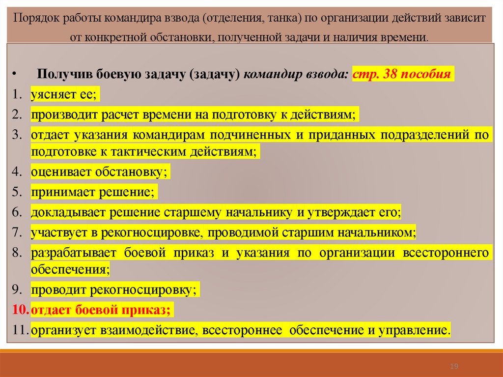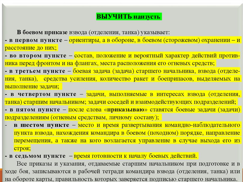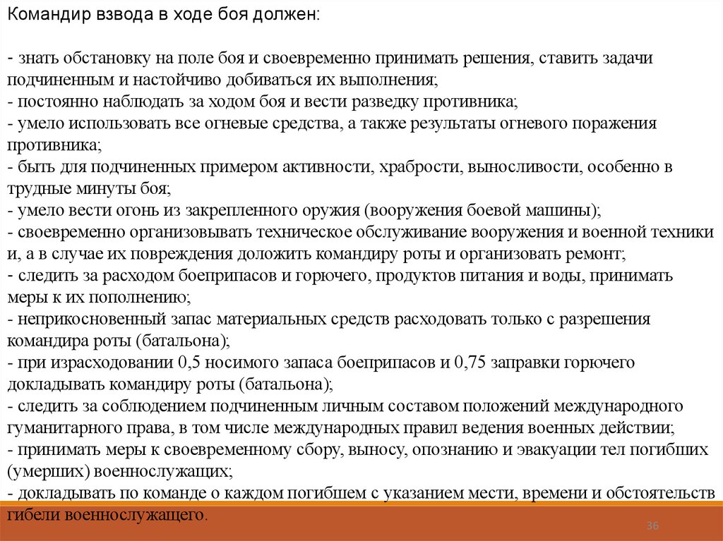 Командир взвода в ходе боя должен:- знать обстановку на поле боя и своевременно принимать решения, ставить задачи