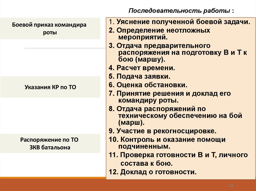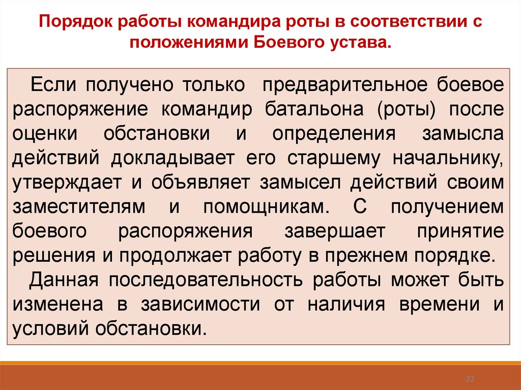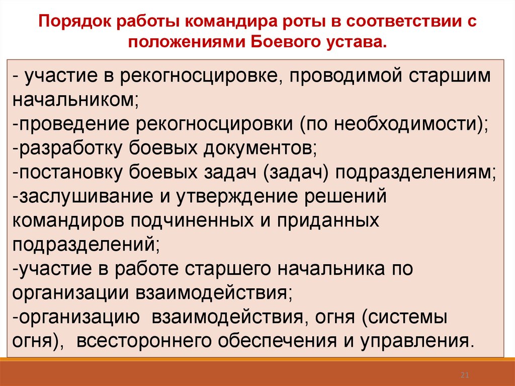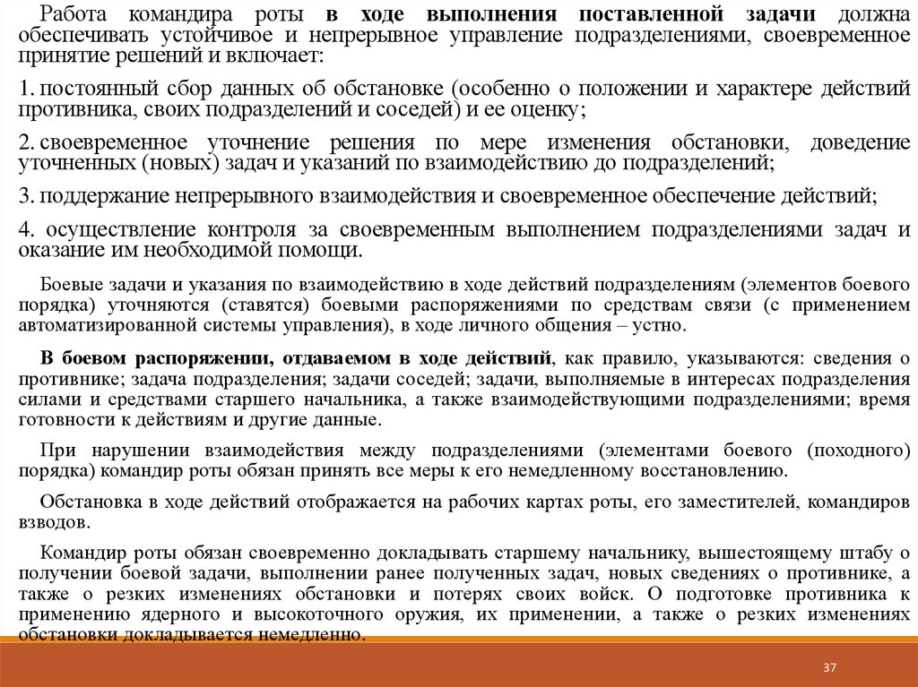 Работа командира роты в ходе выполнения поставленной задачи должнаобеспечивать устойчивое и непрерывное управление подразделениями, своевременное
