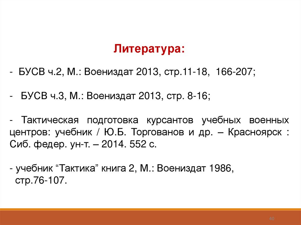 Литература:- БУCВ ч.2, М.: Воениздат 2013, стр.11-18, 166-207;