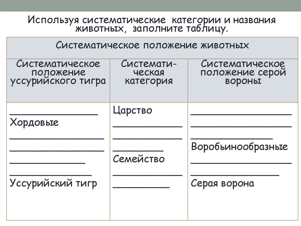 Используя систематические категории и названияживотных, заполните таблицу.