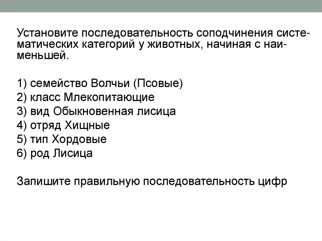 Установите последовательность соподчинения систематических категорий у животных, начиная с наименьшей.1) семейство Волчьи (Псовые)
