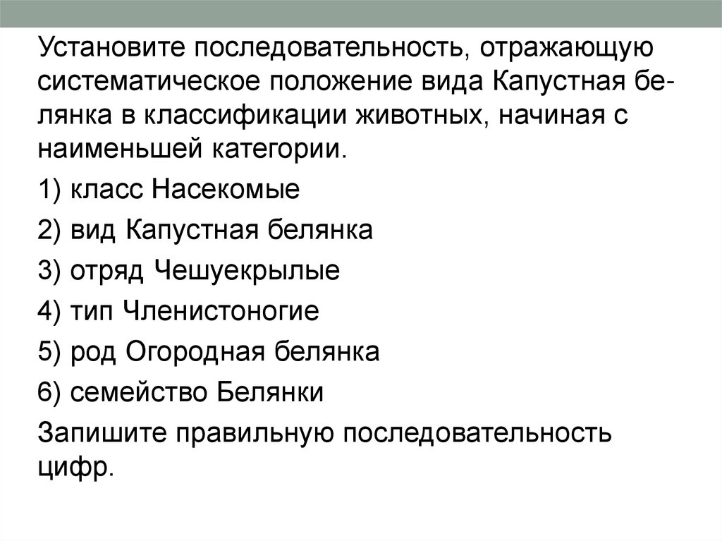 Установите последовательность, отражающуюсистематическое положение вида Капустная белянка в классификации животных, начиная с