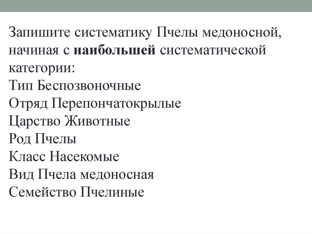 Запишите систематику Пчелы медоносной,начиная с наибольшей систематической