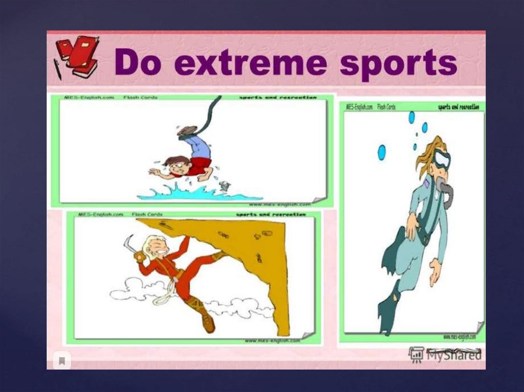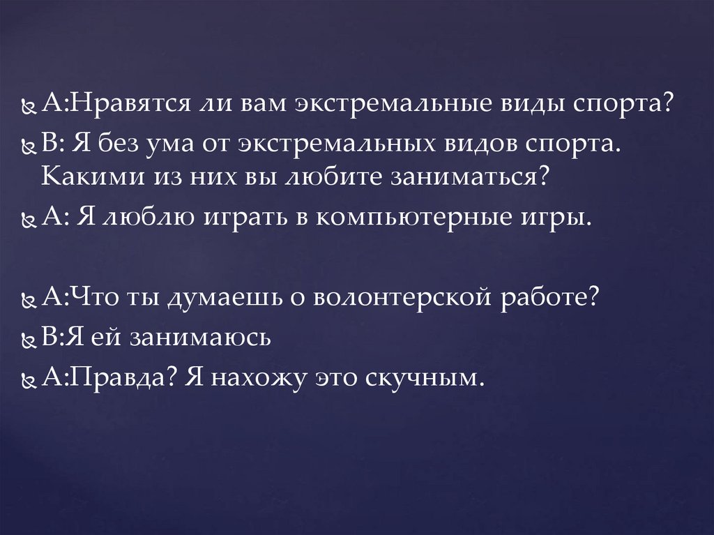 А:Нравятся ли вам экстремальные виды спорта?B: Я без ума от экстремальных видов спорта.
