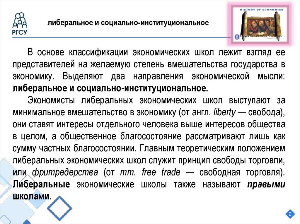 либеральное и социально-институциональноеВ основе классификации экономических школ лежит взгляд ее