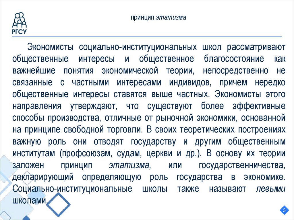 принцип этатизмаЭкономисты социально-институциональных школ рассматривают