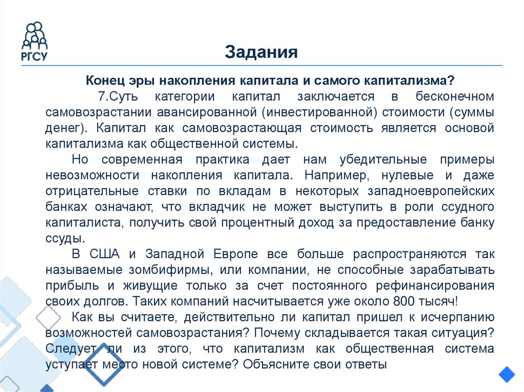 ЗаданияКонец эры накопления капитала и самого капитализма?