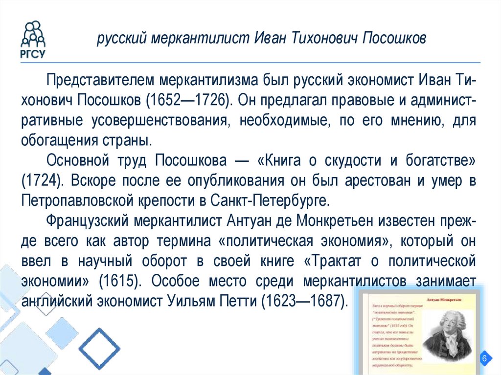 русский меркантилист Иван Тихонович ПосошковПредставителем меркантилизма был русский экономист Иван Тихонович Посошков (1652—1726). Он предлагал правовые и административные усовершенствования, необходимые, по его мнению, для