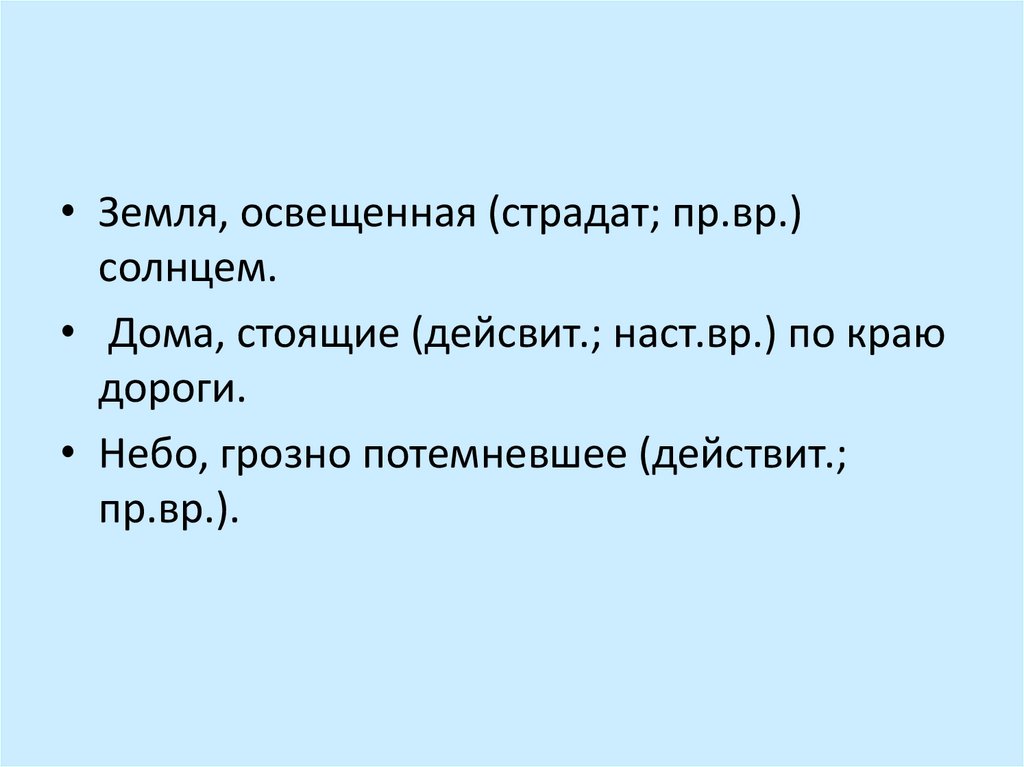 • Земля, освещенная (страдат; пр.вр.)солнцем.