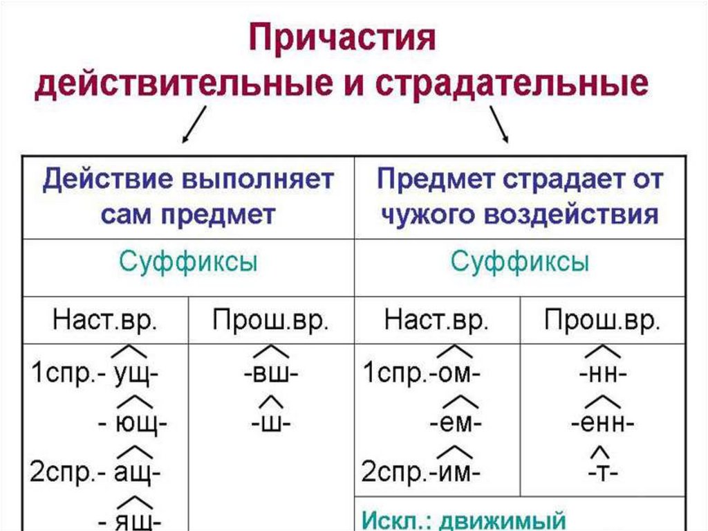 -ущ-( -ющ-), -ащ-(-ящ-), -вш-, -ш-; -ем- (-ом-), -им-, -нн-, -енн-(-ённ-), -топределениями
