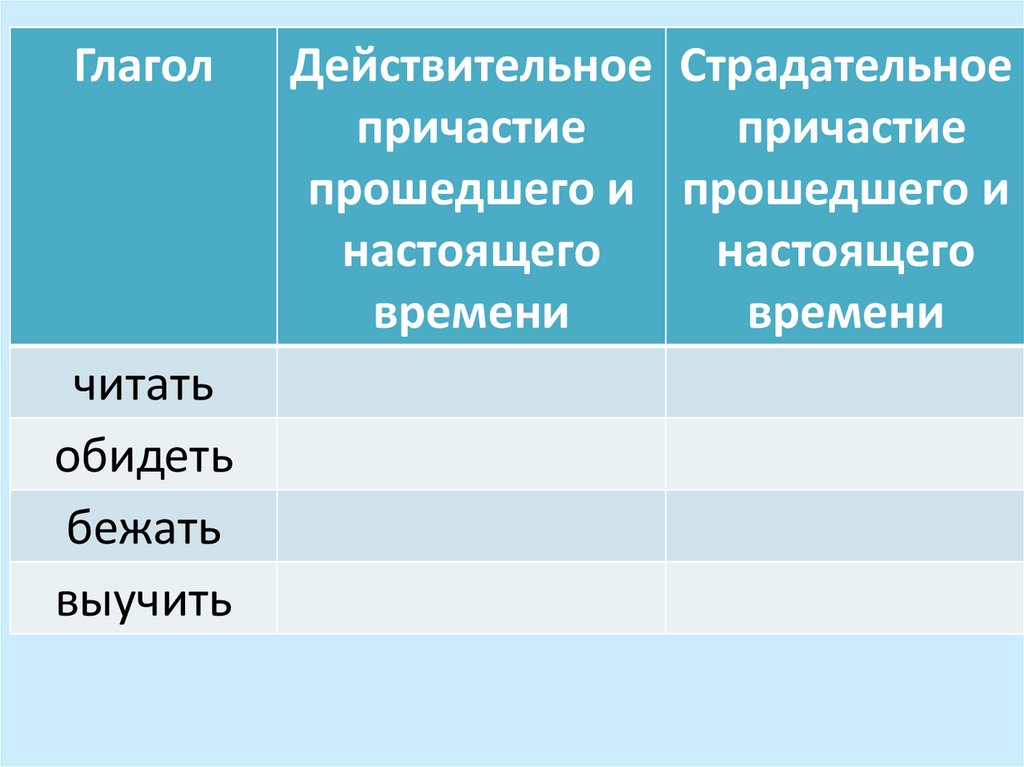 выучить правило• Преобразовать глаголы в причастия: