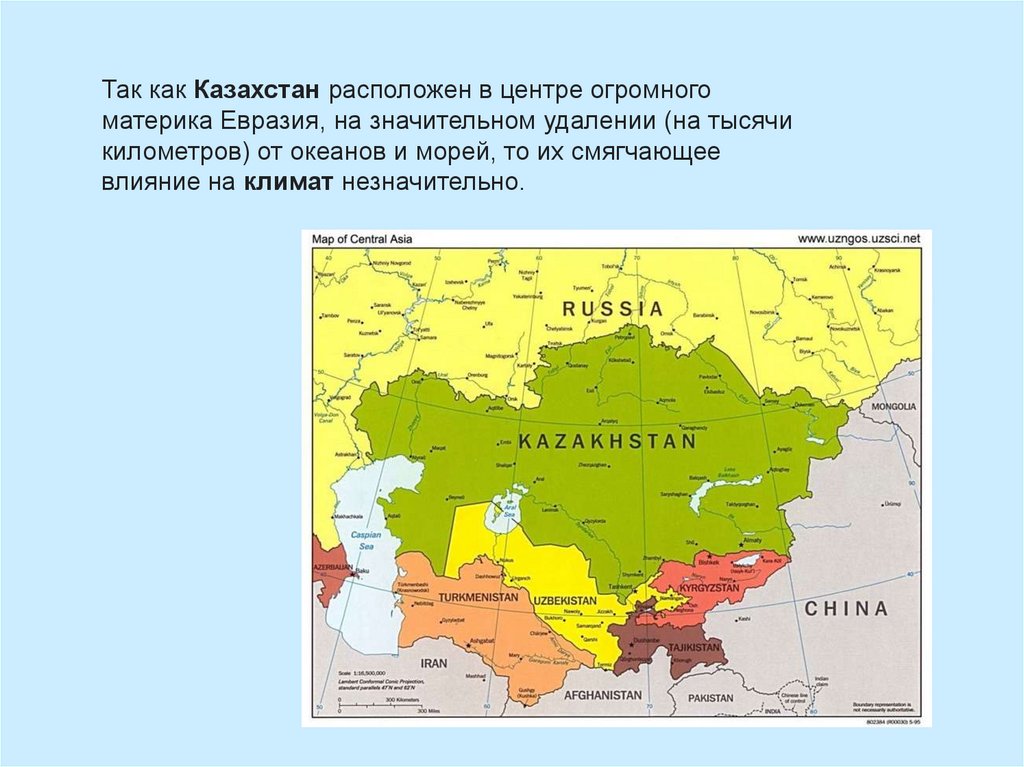Так как Казахстан расположен в центре огромногоматерика Евразия, на значительном удалении (на тысячи