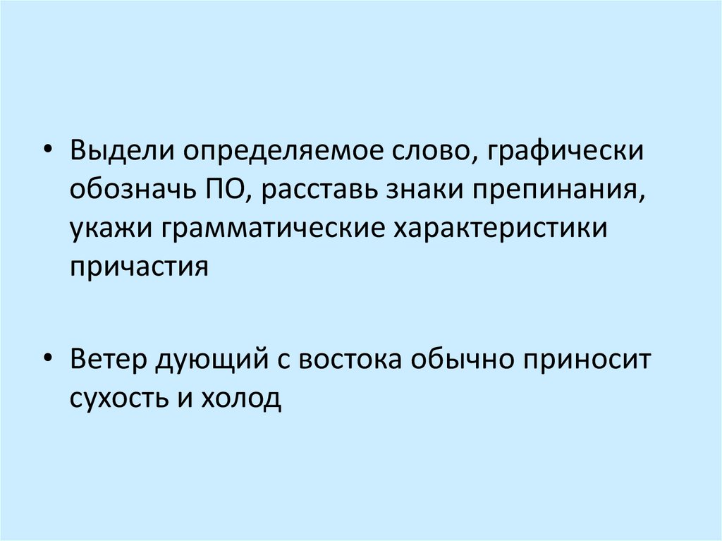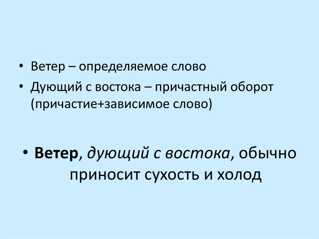 • Ветер – определяемое слово• Дующий с востока – причастный оборот