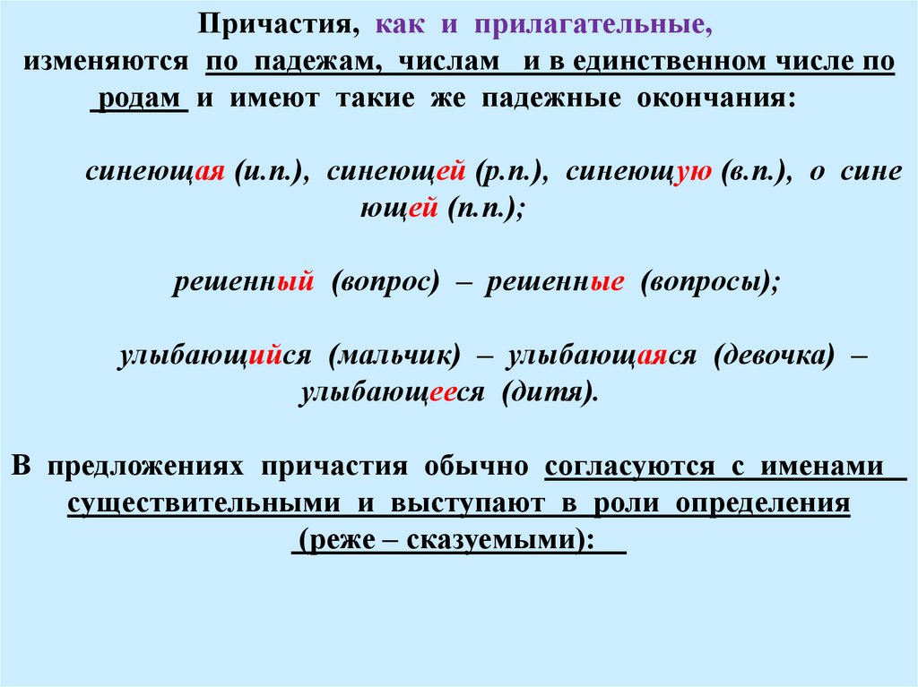 Причастия, как и прилагательные,изменяются по падежам, числам и в единственном числе по