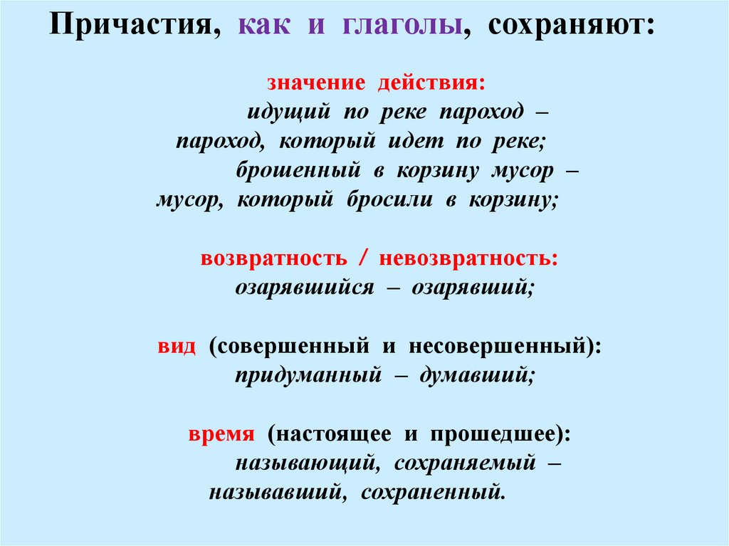 Причастия, как и глаголы, сохраняют:значение действия: