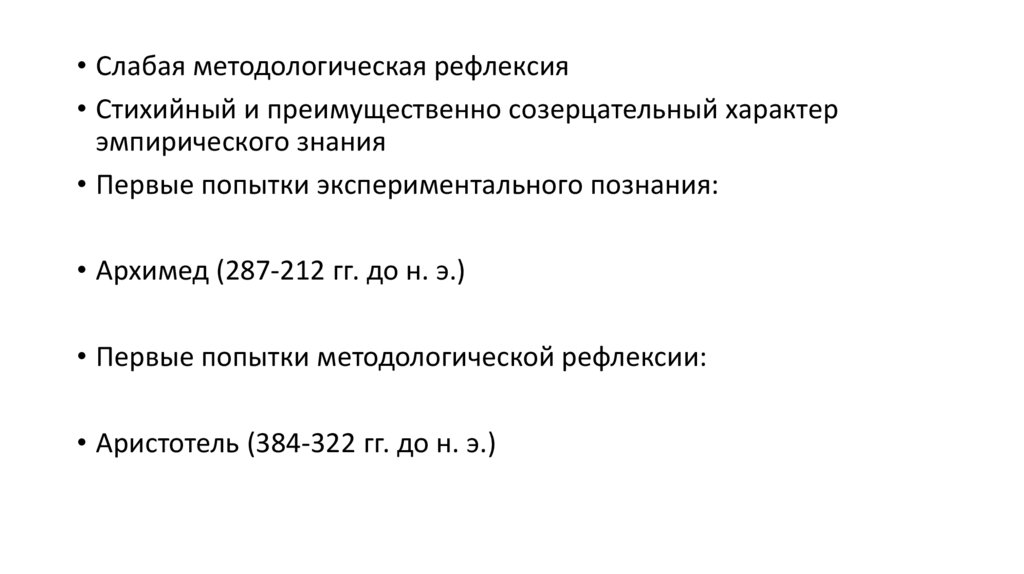 • Слабая методологическая рефлексия• Стихийный и преимущественно созерцательный характер