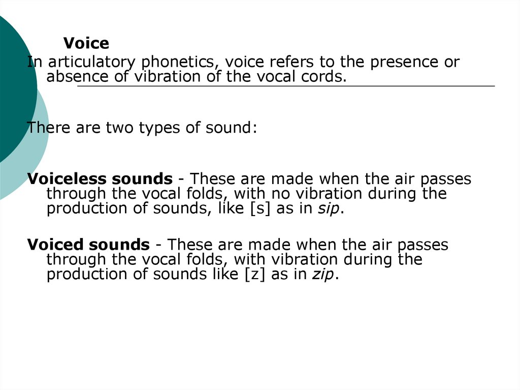 VoiceIn articulatory phonetics, voice refers to the presence or