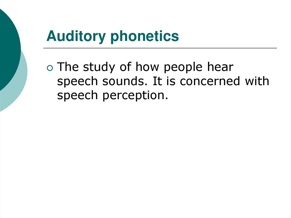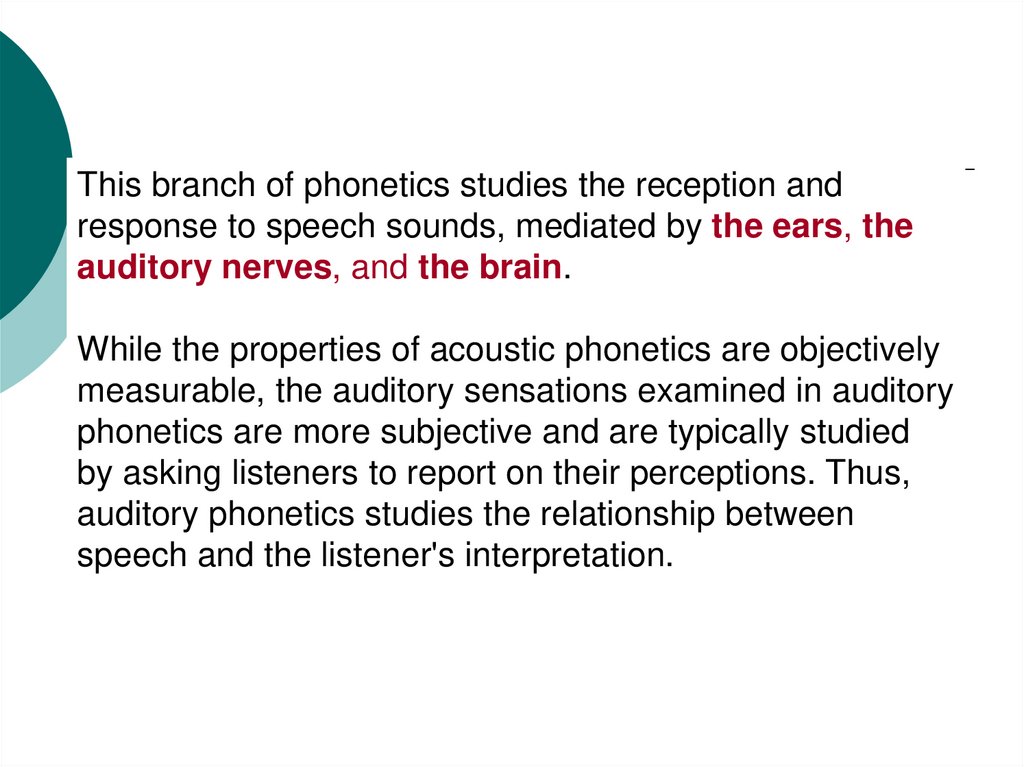 This branch of phonetics studies the reception andresponse to speech sounds, mediated by the ears, the