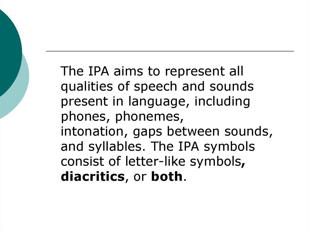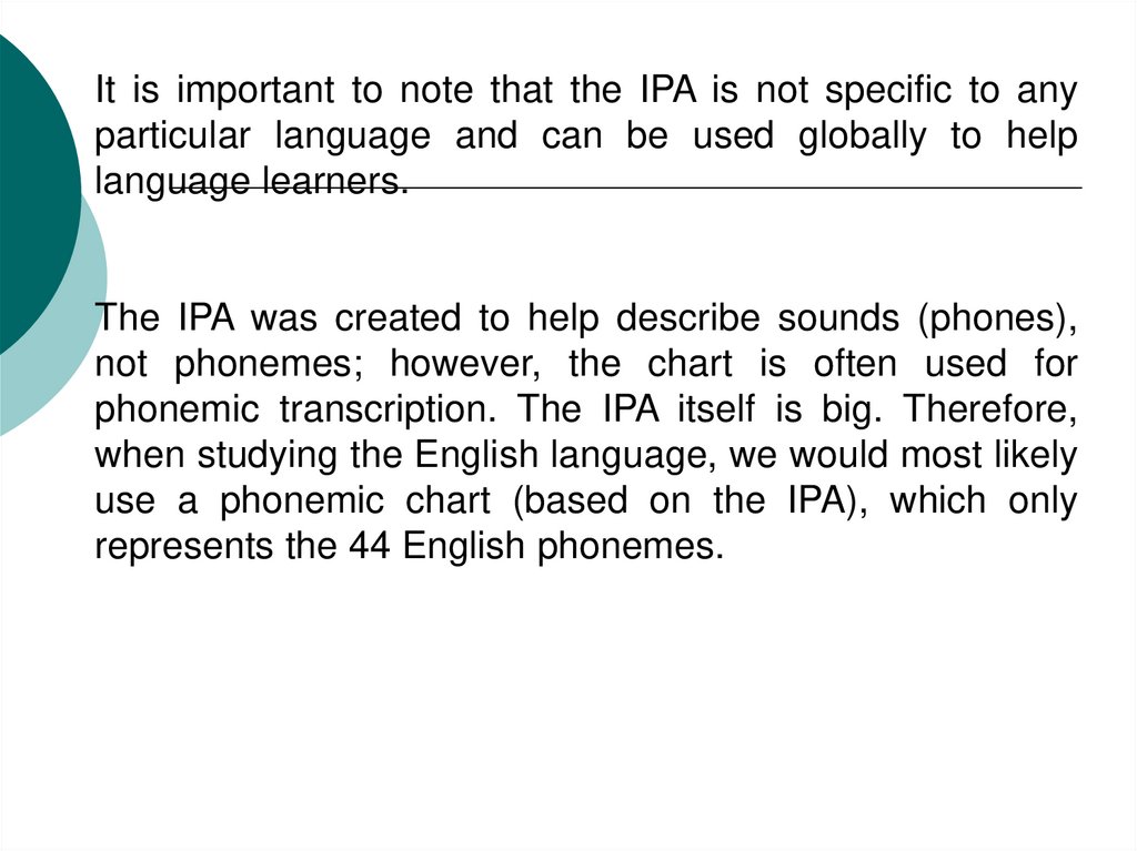 It is important to note that the IPA is not specific to anyparticular language and can be used globally to help