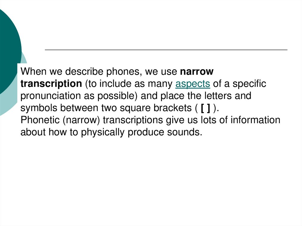 When we describe phones, we use narrowtranscription (to include as many aspects of a specific