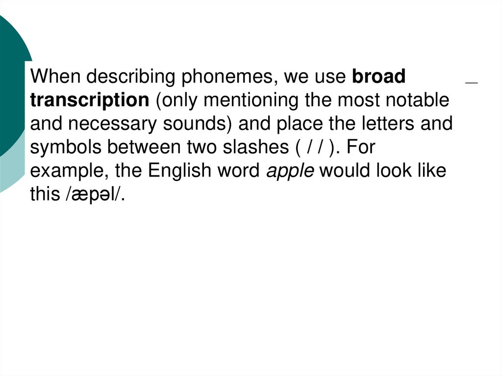 When describing phonemes, we use broadtranscription (only mentioning the most notable