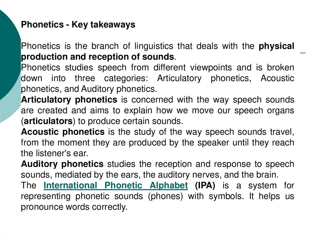 Phonetics - Key takeawaysPhonetics is the branch of linguistics that deals with the physical