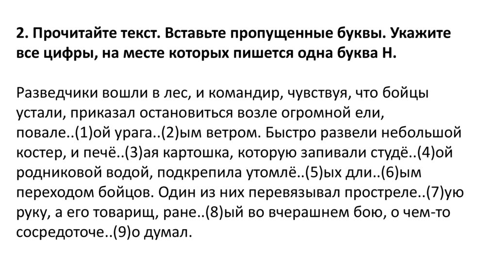 2. Прочитайте текст. Вставьте пропущенные буквы. Укажитевсе цифры, на месте которых пишется одна буква Н.
