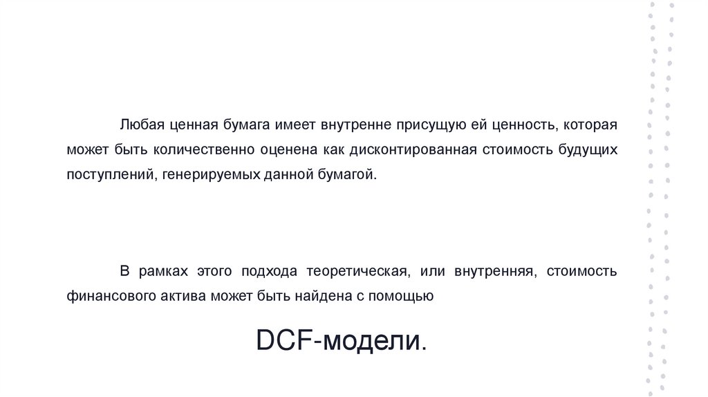 Любая ценная бумага имеет внутренне присущую ей ценность, котораяможет быть количественно оценена как дисконтированная стоимость будущих