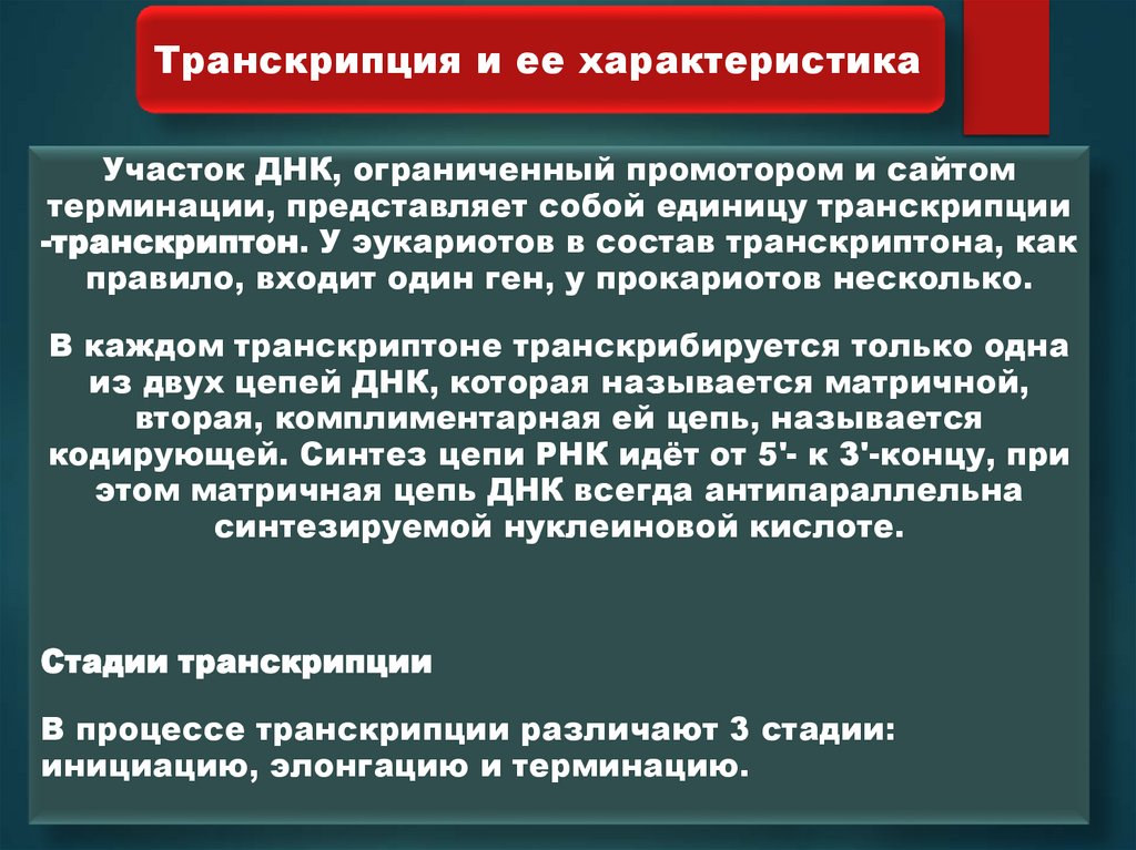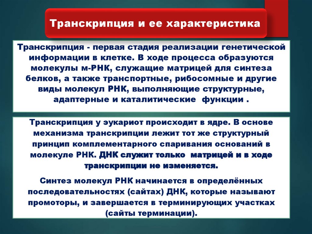 Транскрипция и ее характеристикаТранскрипция - первая стадия реализации генетической