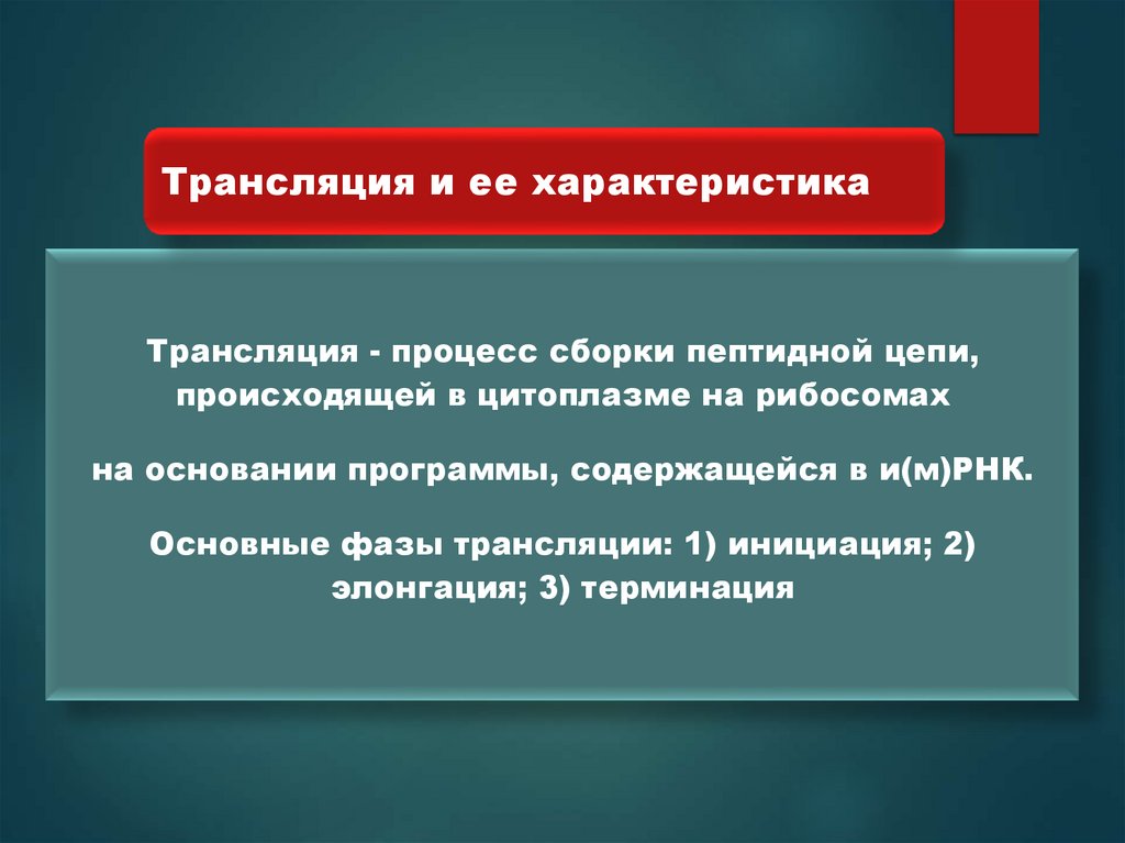 Трансляция и ее характеристикаТрансляция - процесс сборки пептидной цепи,