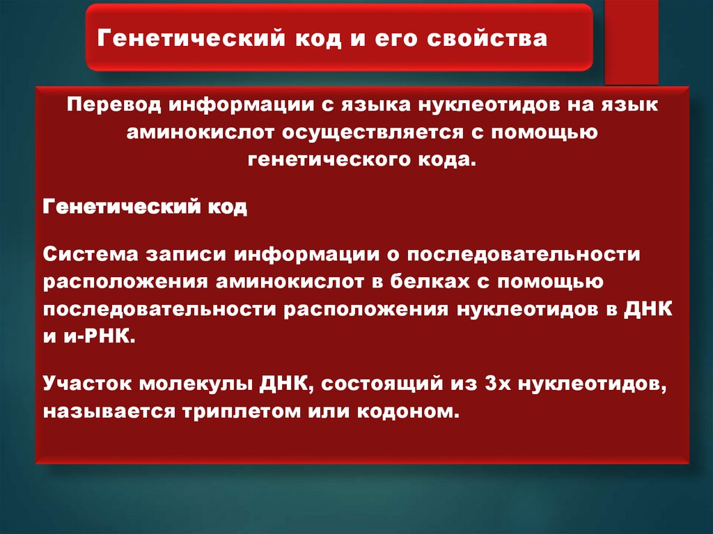 Генетический код и его свойстваПеревод информации с языка нуклеотидов на язык