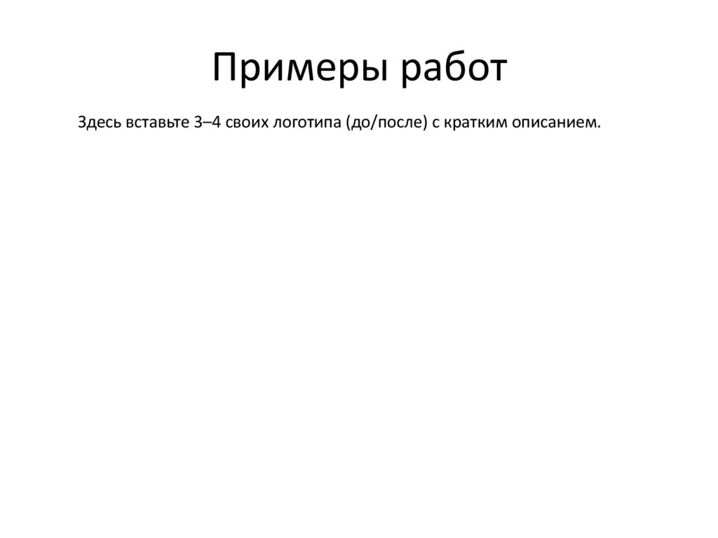 Примеры работЗдесь вставьте 3–4 своих логотипа (до/после) с кратким описанием.