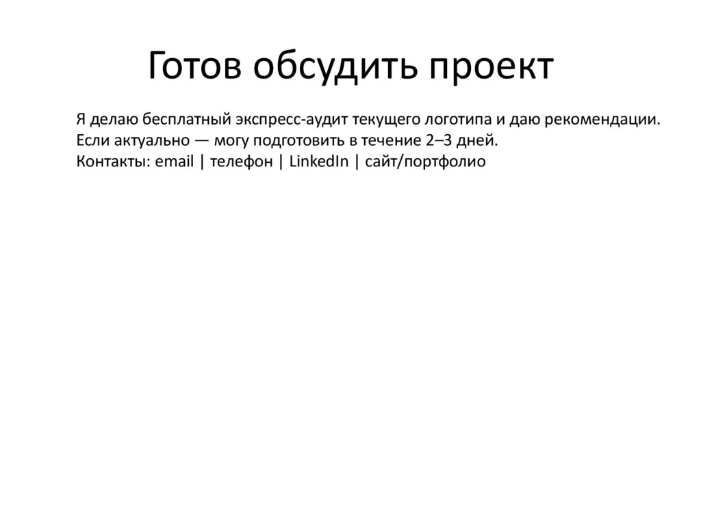 Готов обсудить проектЯ делаю бесплатный экспресс-аудит текущего логотипа и даю рекомендации.