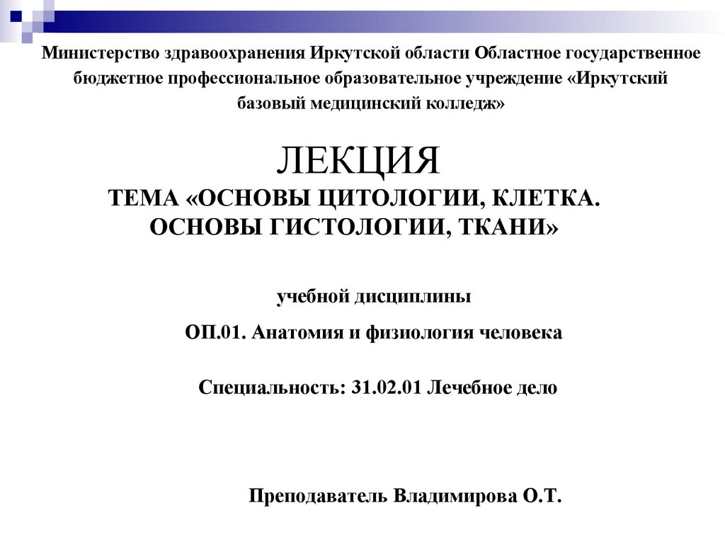 1. Лекция тема «Основы цитологии, клетка. Основы гистологии, ткани»