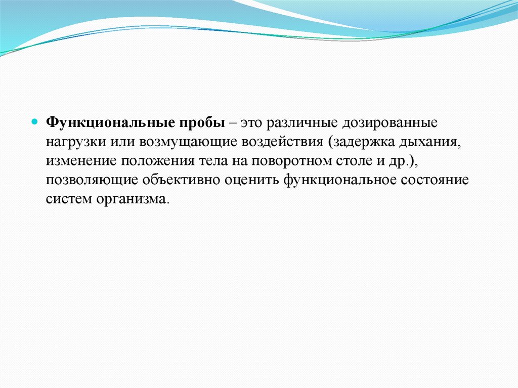 Функциональные пробы – это различные дозированныенагрузки или возмущающие воздействия (задержка дыхания,