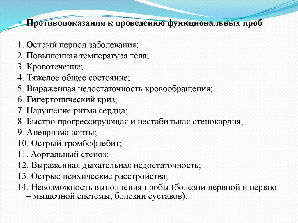 Противопоказания к проведению функциональных проб1. Острый период заболевания;