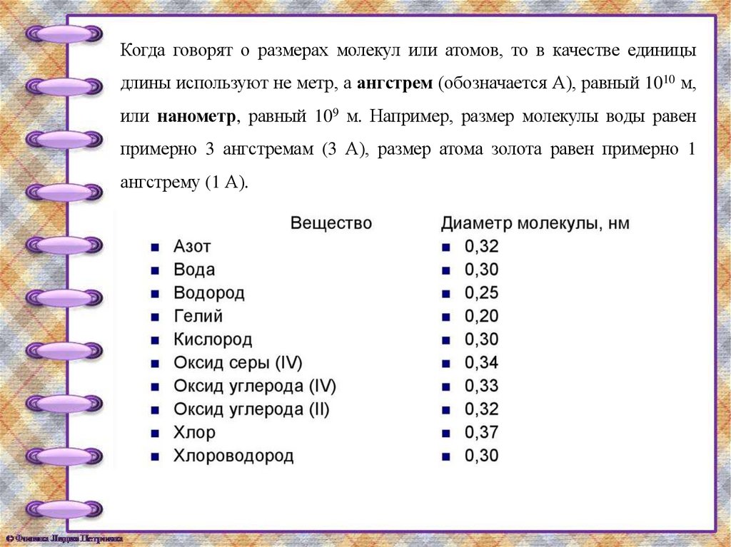 Когда говорят о размерах молекул или атомов, то в качестве единицыдлины используют не метр, а ангстрем (обозначается А), равный 1010 м,