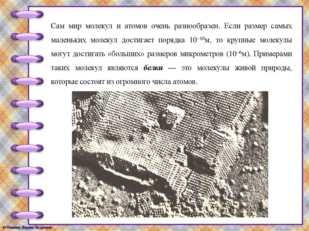 Сам мир молекул и атомов очень разнообразен. Если размер самыхмаленьких молекул достигает порядка 10–10м, то крупные молекулы
