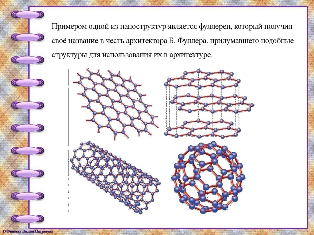 Примером одной из наноструктур является фуллерен, который получилсвоё название в честь архитектора Б. Фуллера, придумавшего подобные