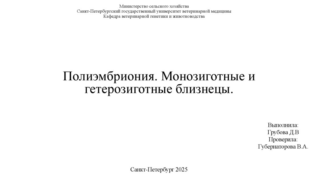 1. Министерство сельского хозяйства Санкт-Петербургский государственный университет ветеринарной медицины Кафедра ветеринарной