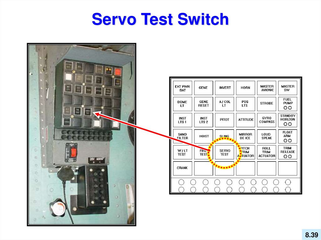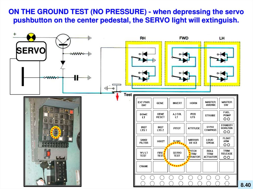 ON THE GROUND TEST (NO PRESSURE) - when depressing the servopushbutton on the center pedestal, the SERVO light will extinguish.