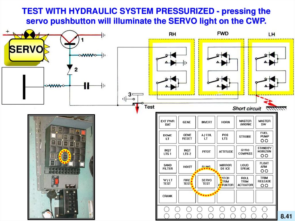 TEST WITH HYDRAULIC SYSTEM PRESSURIZED - pressing theservo pushbutton will illuminate the SERVO light on the CWP.