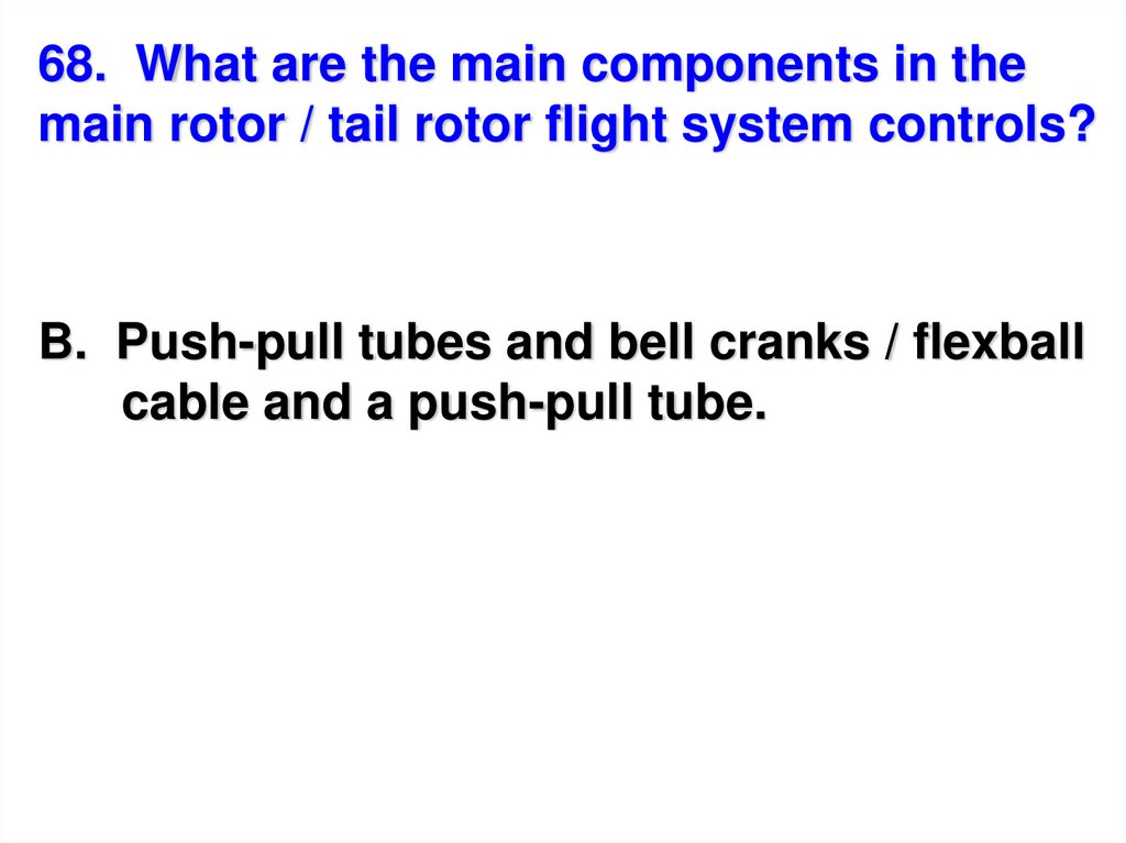 68. What are the main components in themain rotor / tail rotor flight system controls?