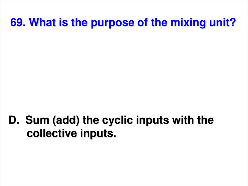 69. What is the purpose of the mixing unit?D. Sum (add) the cyclic inputs with the