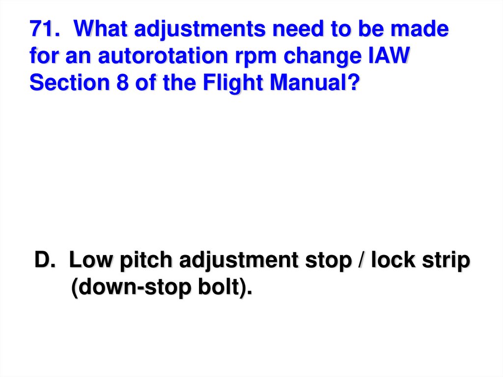 71. What adjustments need to be madefor an autorotation rpm change IAW