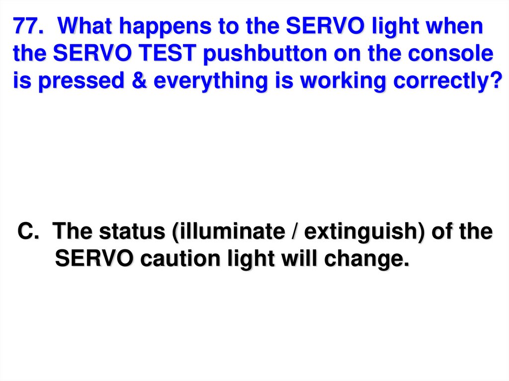 77. What happens to the SERVO light whenthe SERVO TEST pushbutton on the console