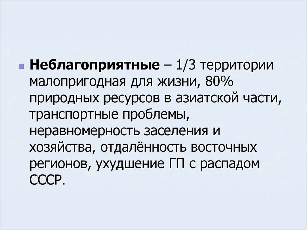 Неблагоприятные – 1/3 территориималопригодная для жизни, 80%